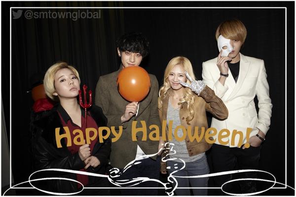 Three photos were tweeted via @SMTOWNGLOBAL featuring SNSD’s Sunny and Hyoyeon, EXO M’s Tao and Kris, TVXQ and EXO K’s Sehun, Kai and Suho with caption “Happy Halloween”.