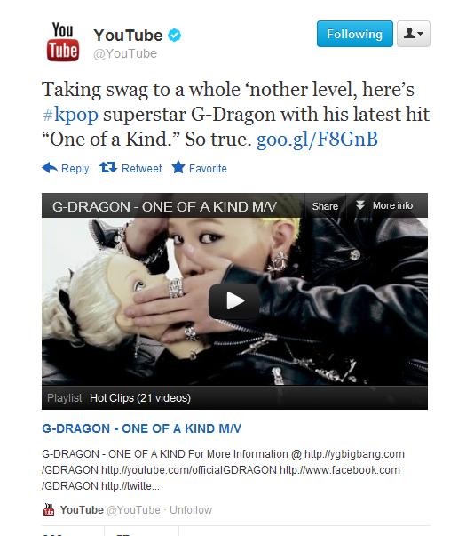 G-dragon‘s new single “one of a kind” has been on k-pop fan’s lips since the release of the teaser MV, way before that for some fans! His official music video posted by “Big Bang“s youtube channel has nearly 7million views within 5 days. The popularity of G.D‘s video has been such a hot topic that youtube has to tweet about this video.